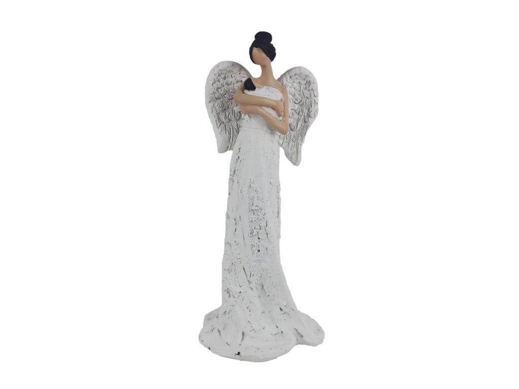 Dekorační anděl s miminkem. Rozměry: 8 x 7 x 19,5 cm. Materiál: polyresin. Barva: bílá. Není hračka. Určeno do vnitřních prostor.Doplňkové parametry
