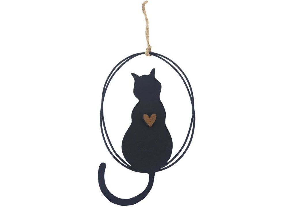Dekorace k zavěšení s kočkou. Rozměry: 10 x 1 x 16 cm. Materiál: kov. Barva: černá. Není hračka. Určeno do vnitřních prostor.Doplňkové parametry