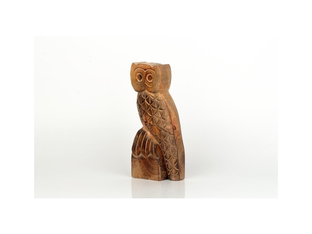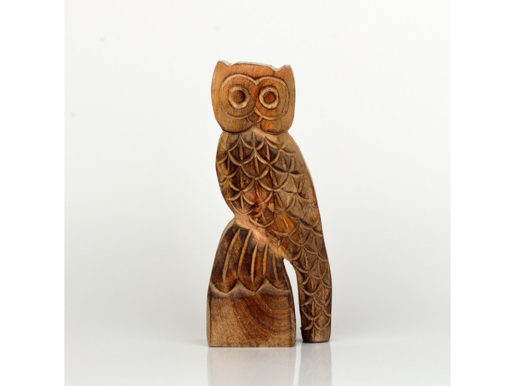 Dekorace sova z mangového dřeva. Soška sovy je vysoká 21cm s šířkou 9cm z materiálu o síle 4,5cm.