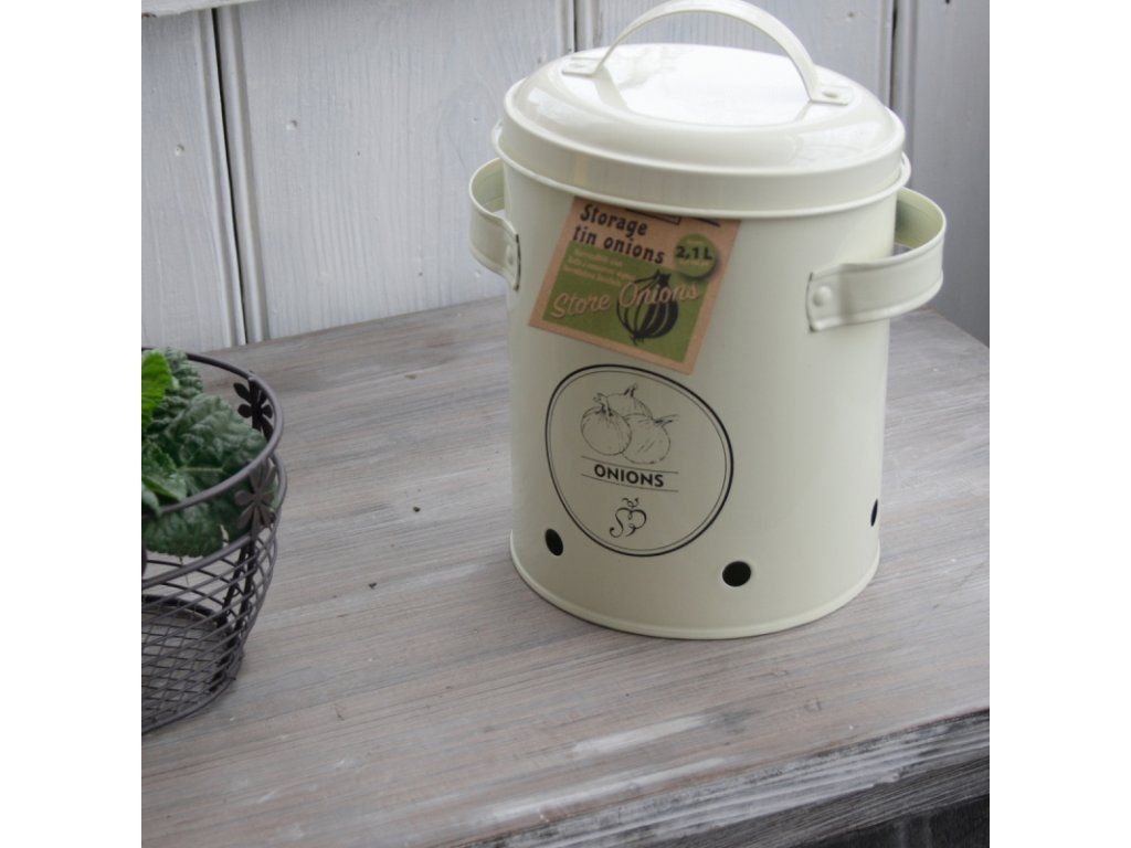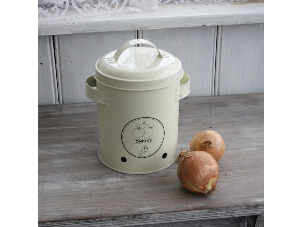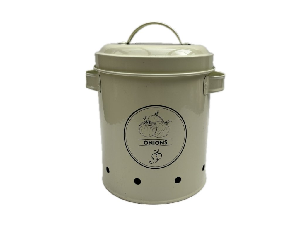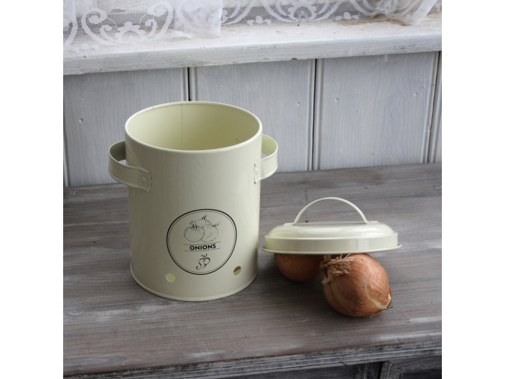 Dóza má otvory na cirkulaci vzduchu a je zdobena motivem cibule na přední straně. Dóza je z nové kolekce kuchyňských doplňků, které skvěle vypadají ve venkovsky laděné kuchyni.