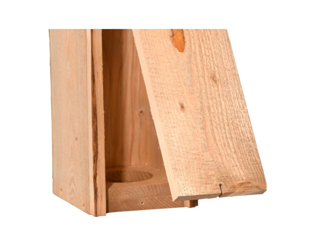Dřevěná budka má na spodní straně vyhloubený otvor pro vejce, takže datel nebo strakapoud bude mít bezpečné zázemí pro hnízdění.