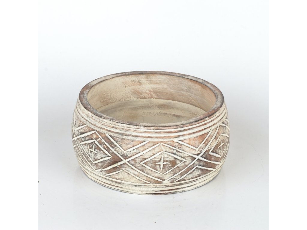 Dřevěná miska vyráběná ručně z mangového dřeva je téměř věčná. Její okraje jsou řezbářky zdobené.