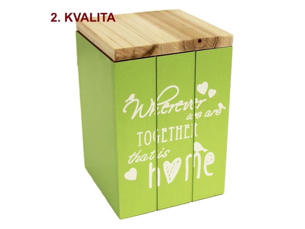 Dřevěný box na různá využití. Box je ve 2. jakosti. Místy jsou boxy podřené, nedoléhá vrch boxu. Rozměry: 9,5 x 9,5 x 14 cm. Materiál: dřevo. Barva: zelená, přírodní. Údržba výrobku: Utřít hadříkem.Doplňkové parametry