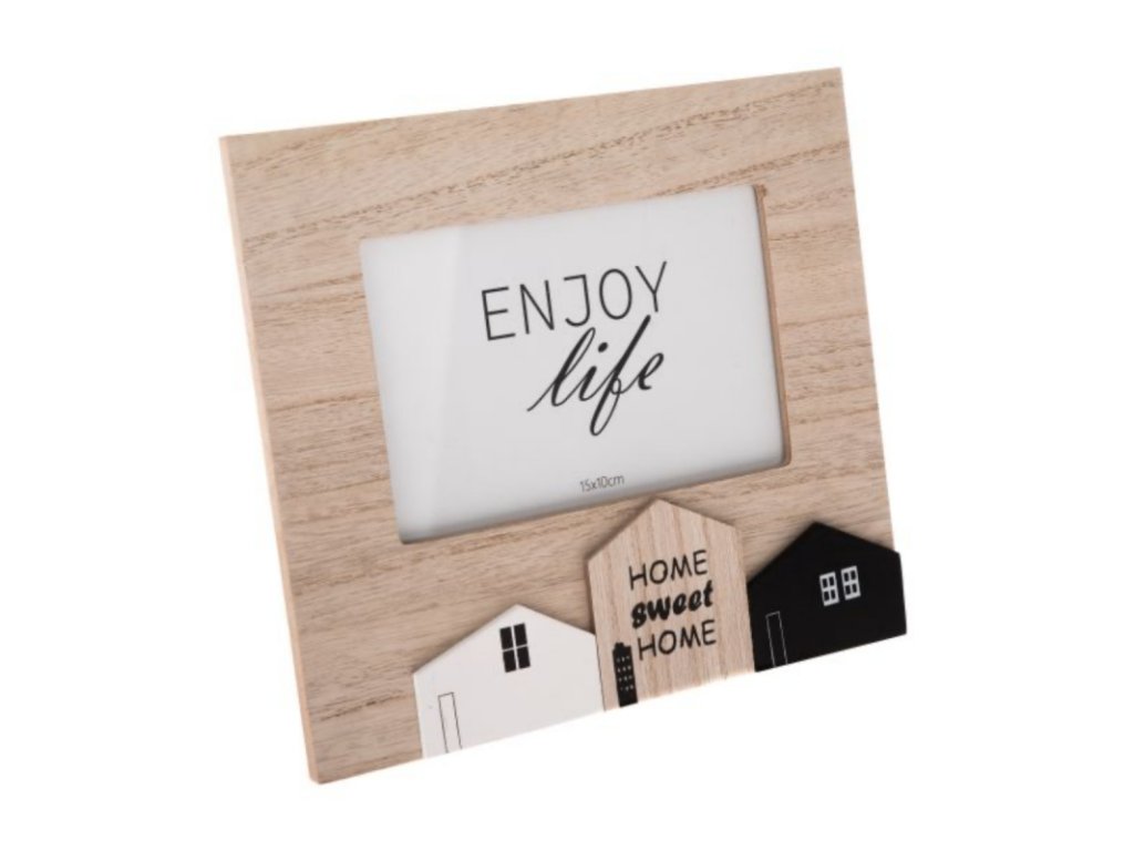 Fotorámeček dřevěný stojací s domečky 21×19×0,8 cm