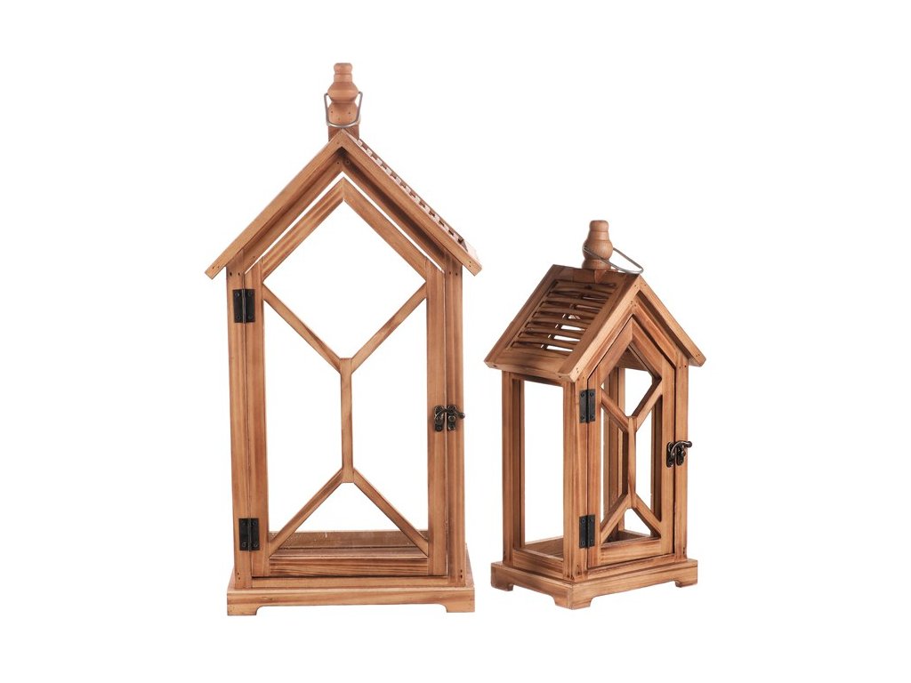 Dřevěná lucerna ve tvaru domku v sadě dvou různě velkých kusů se skvěle hodí do každého interiéru i exteriéru. Celodřevěná konstrukce v přírodní barvě je doplněna velkými čirými skly na všech stranách, která umožňují plně vychutnat světlo svíčky. Elegantní dvířka přidávají na praktičnosti, zatímco malé kovové madlo na střeše umožňuje snadné přenášení.Doplňkové parametry
