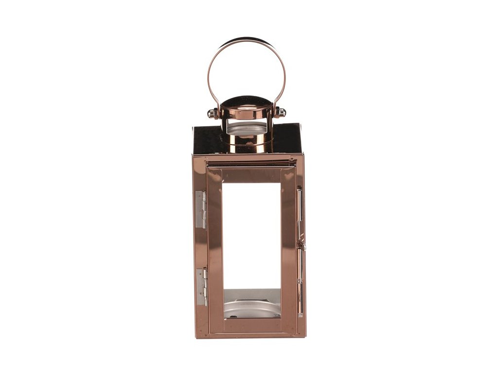 Mini lucerna s kovovými rámy a prosklenými stěnami přináší jednoduchou eleganci do každého prostoru. Čtyřboký tvar, lesklý metalický povrch v měděném odstínu a nízký komínek, jí dodávají jemný, sofistikovaný vzhled. Díky pevnému madlu ji můžete snadno pověsit nebo ji postavit na stůl a užít si hřejivou atmosféru mihotavého světla.Doplňkové parametry