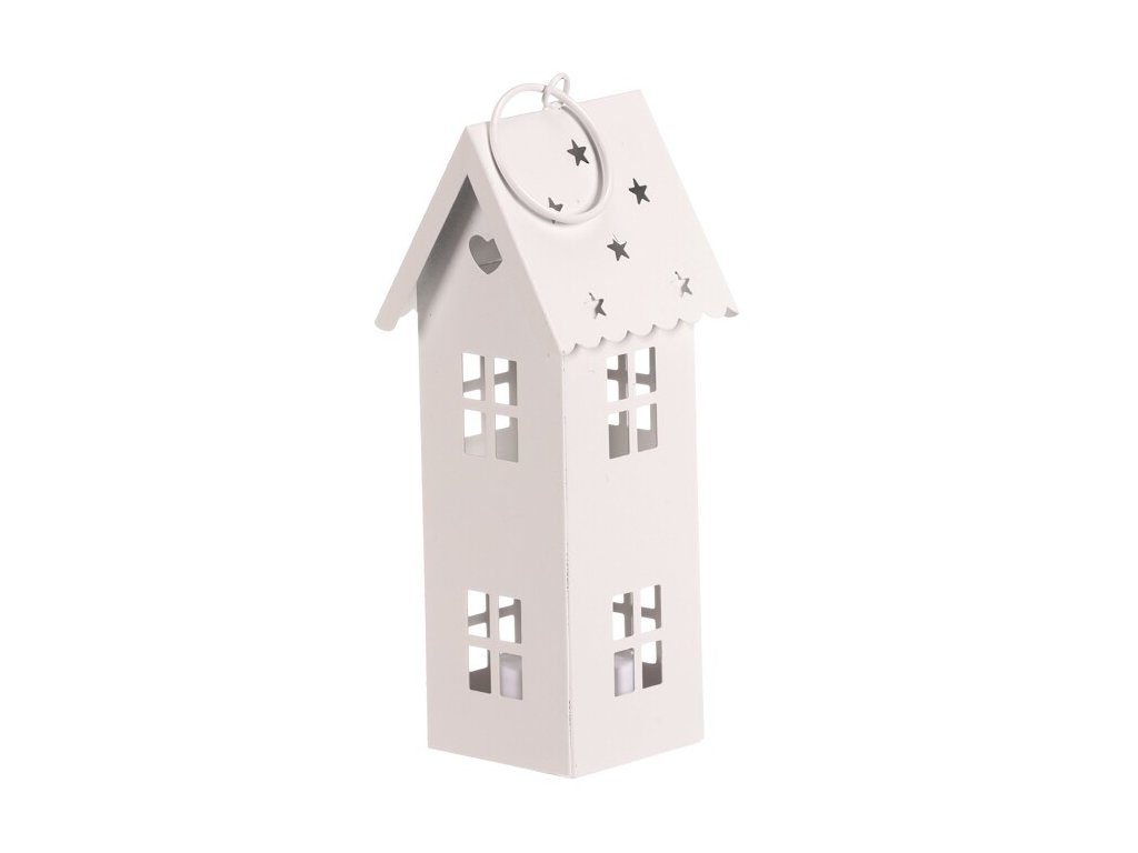 Mini kovová lucerna ve tvaru patrového domku je půvabnou dekorací pro váš interiér. Bílá barva jí dodává jemný vzhled, zatímco detailně zpracovaná okénka a hvězdičkové otvory ve stříšce krásně propouštějí světlo LED svíčky. Můžete ji postavit na stůl nebo zavěsit za očko a vytvořit si tak kouzelnou atmosféru.Doplňkové parametry