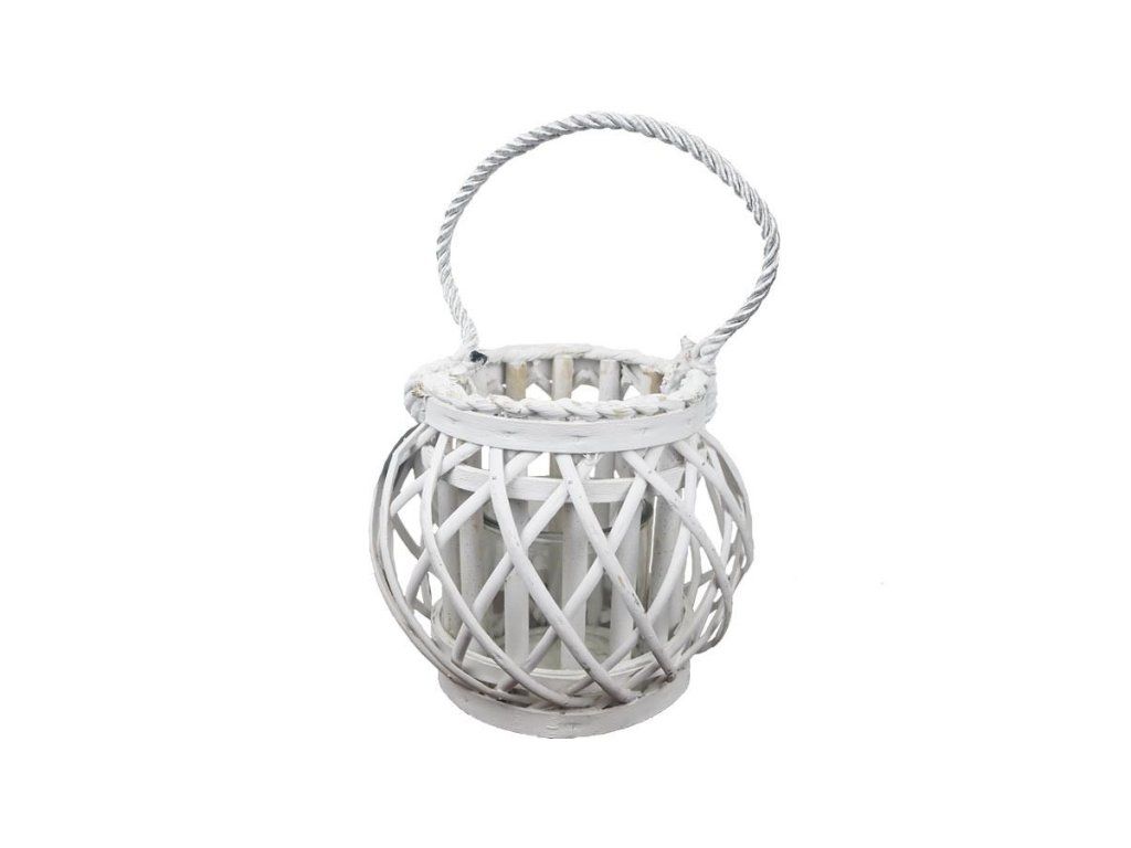 Svícen na jednu svíčku. Svícen může být krásným doplňkem terasy. Svícen má průměr 20 cm, výšku 18 cm. Průměr skla 10 cm. Rozměry: 20 x 20 x 18 cm. Materiál: proutí, sklo. Barva: bílá. Upozornění: Pouze LED/čajové svíčky. Riziko vznícení u vysokých svíček. Pouze v interiéru. Neponechávat bez dozoru.Doplňkové parametry