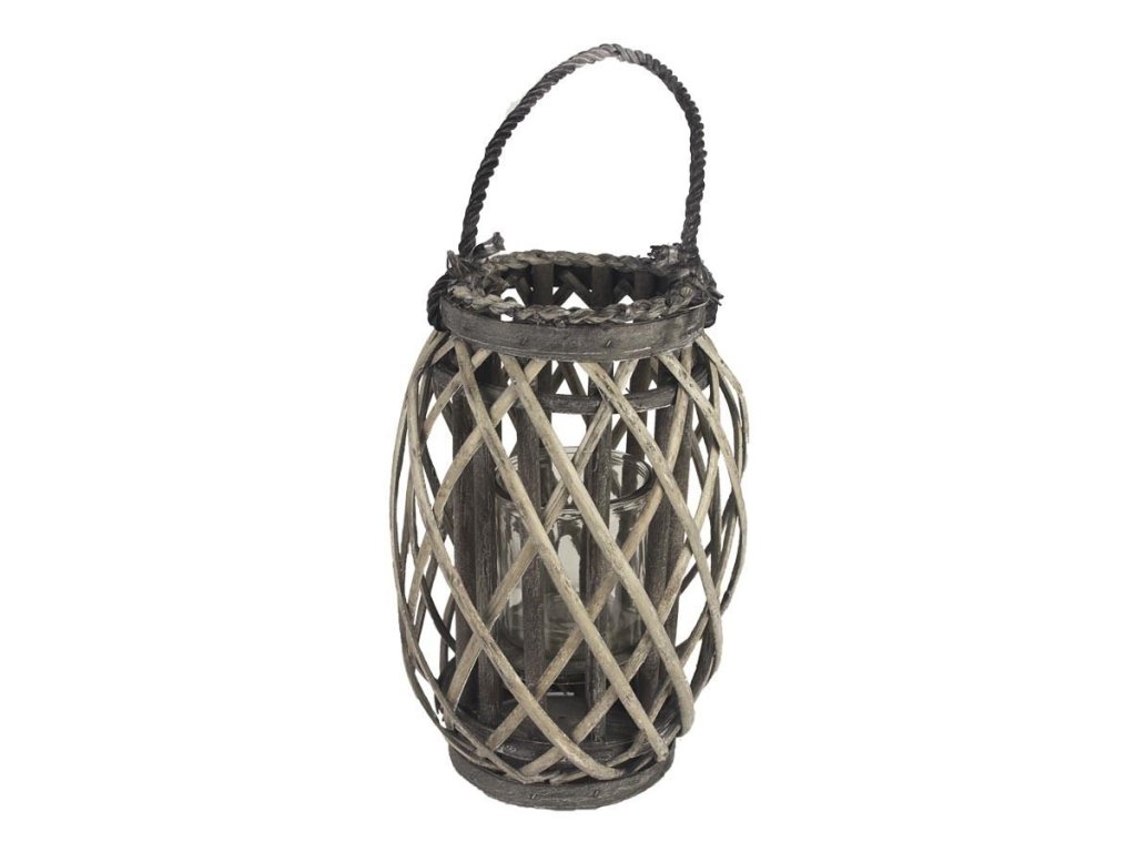 Svícen na jednu svíčku. Svícen může být krásným doplňkem terasy. Rozměry: 20 x 20 x 31 cm. Materiál: proutí, sklo. Barva: šedá. Upozornění: Nenechávejte zapálené svíčky bez dozoru. Dekorace je určena do interiéru. .Doplňkové parametry