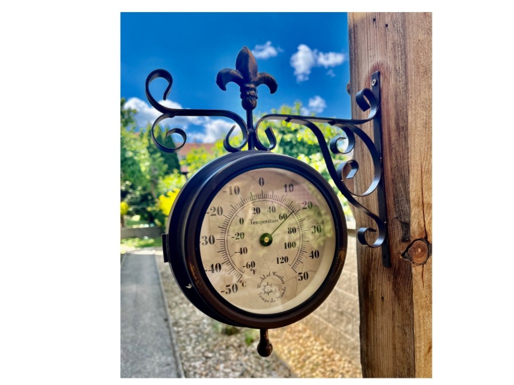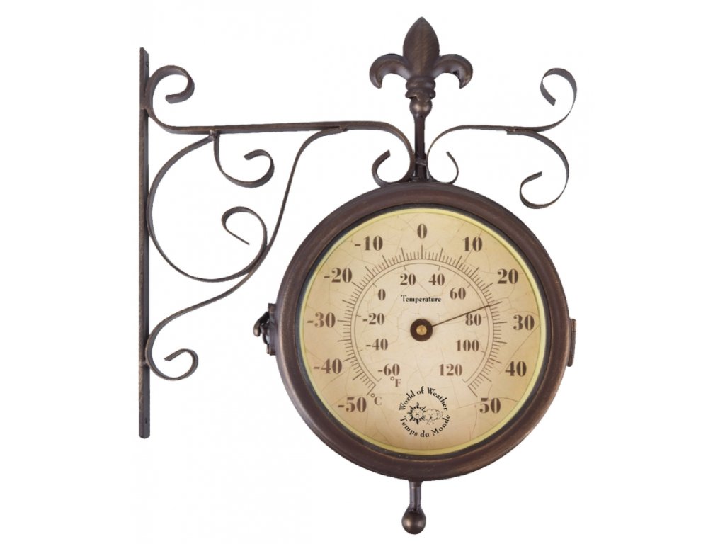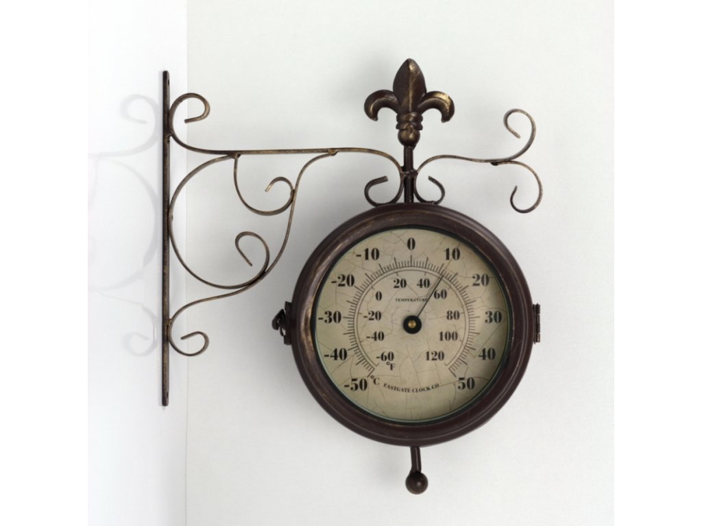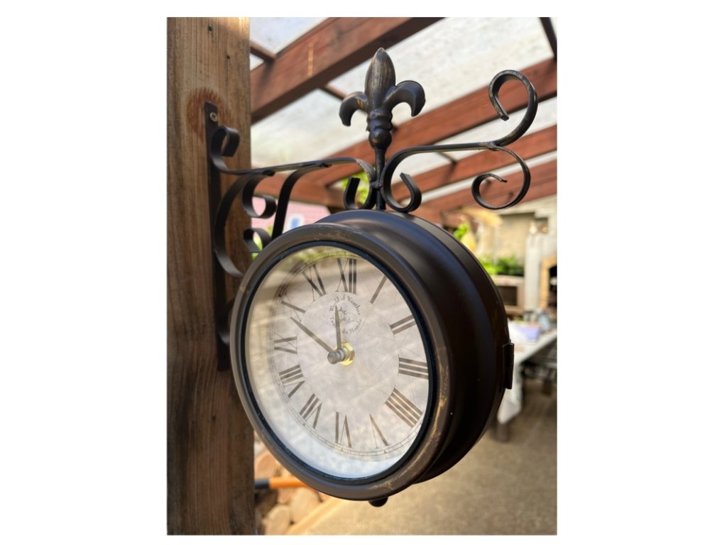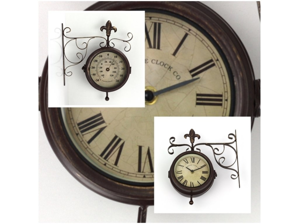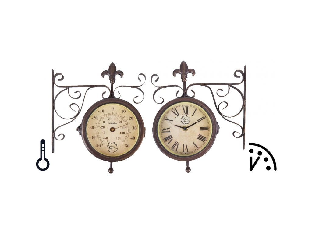 Nádražní venkovní hodiny s teploměrem oboustranné, jsou vhodné pro vnitřní i venkovní použití. Krásně vyniknou v interiéru Vašeho obýváku i na zahradě pod zastřešenou pergolou. Skvělé budou také jako hodiny do altánku.