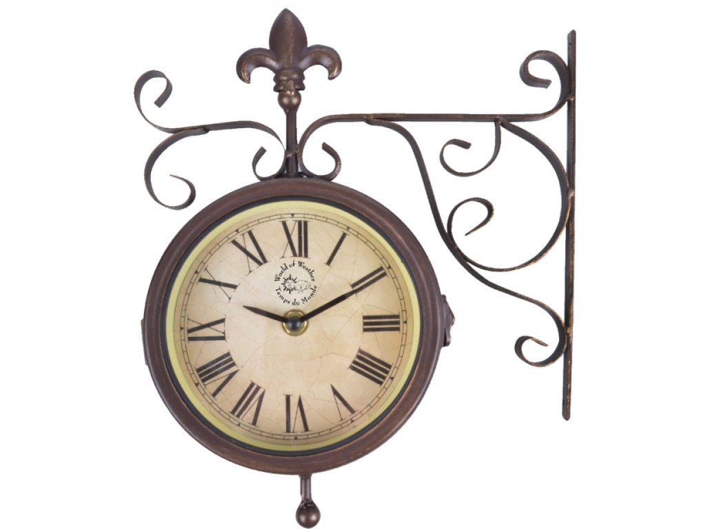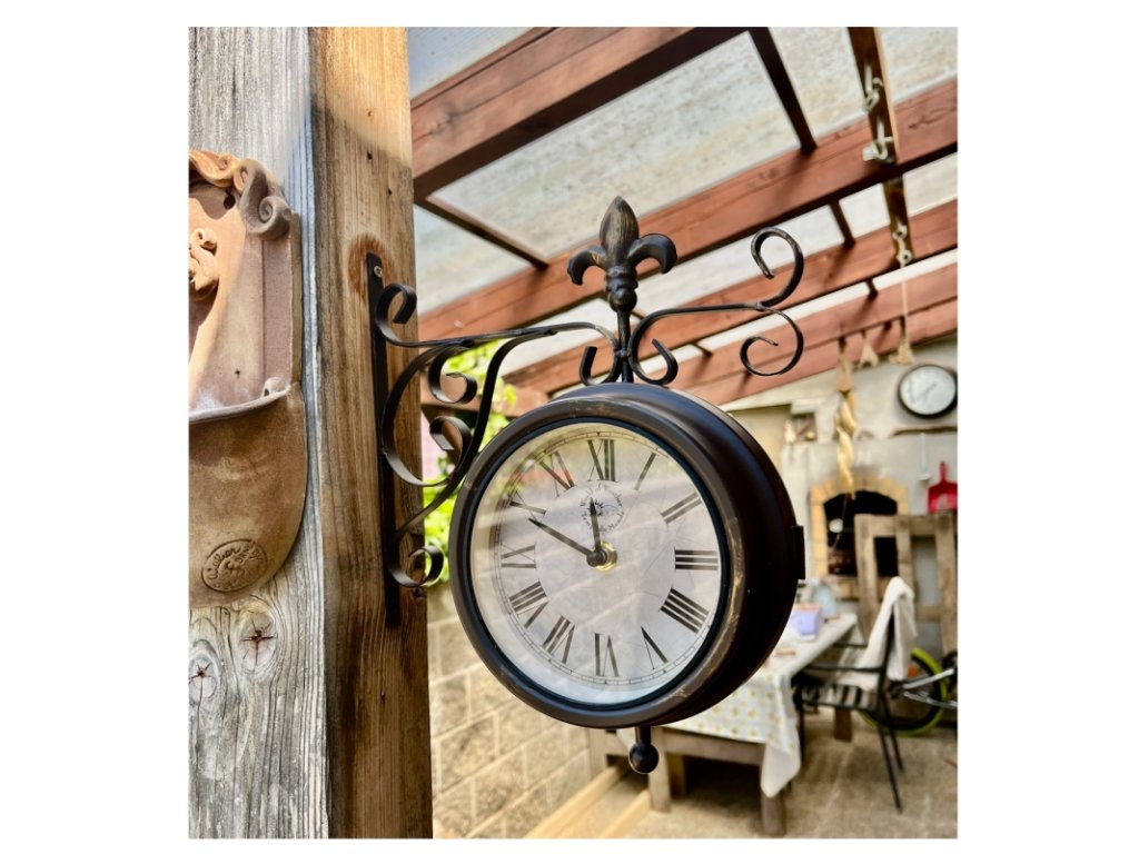 Oboustranné nástěnné hodiny připomínají svým vzhledem styl starého anglického venkova.