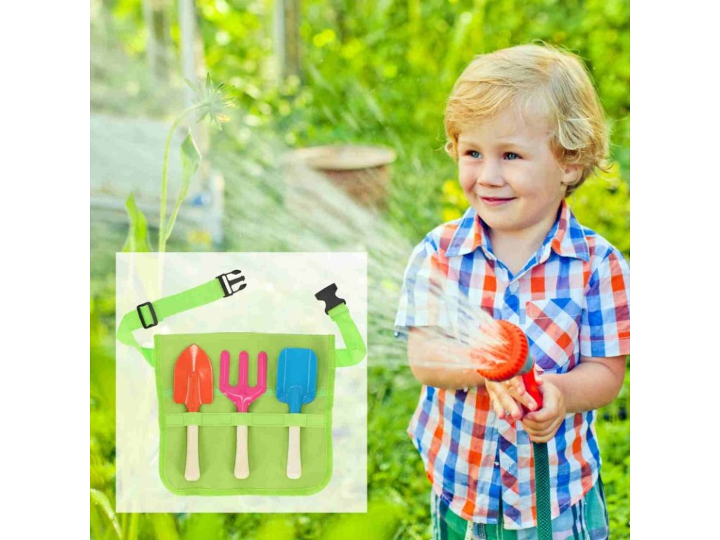 Nářadí pro děti je naprosto ideální vánoční nebo narozeninový dárek pro děti. Set nářadí sestává z plátěné zástěry se zapínáním kolem pasu a 3 kusů základního nářadí - lopatka, hrábě a rýč.