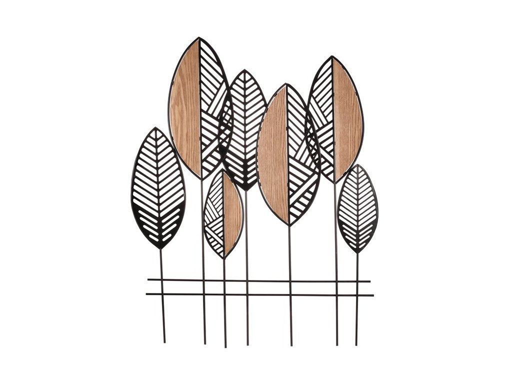 Nástěnná dekorace s kovovými listy, z nichž některé jsou částečně vyplněné dřevem, přináší do prostoru originální kombinaci materiálů. Elegantní provedení a kombinace hnědé a černé barvy z ní činí poutavý prvek, který snadno zaujme a stane se ústředním bodem každé místnosti.Doplňkové parametry