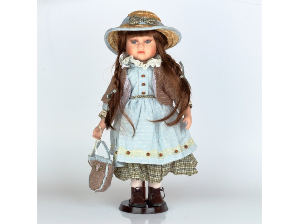 Tato panenka jménem Natálka má modré šaty zdobené zelenými detaily a krajkou, svetřík, slaměný klobouk a kabelku.