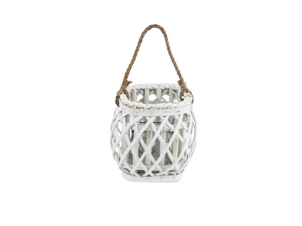 Proutěný svícen bílý. Sklo má průměr 9,5 cm, výšku 10 cm. Rozměry: 18 x 18 x 18 cm. Materiál: proutí. Barva: bílá. Upozornění: Nenechávejte zapálené svíčky bez dozoru. Dekorace je určena do interiéru. .Doplňkové parametry