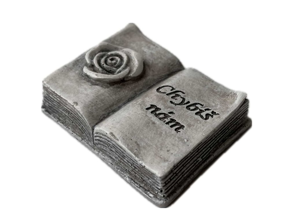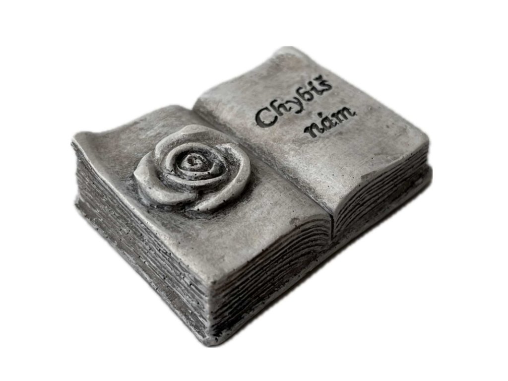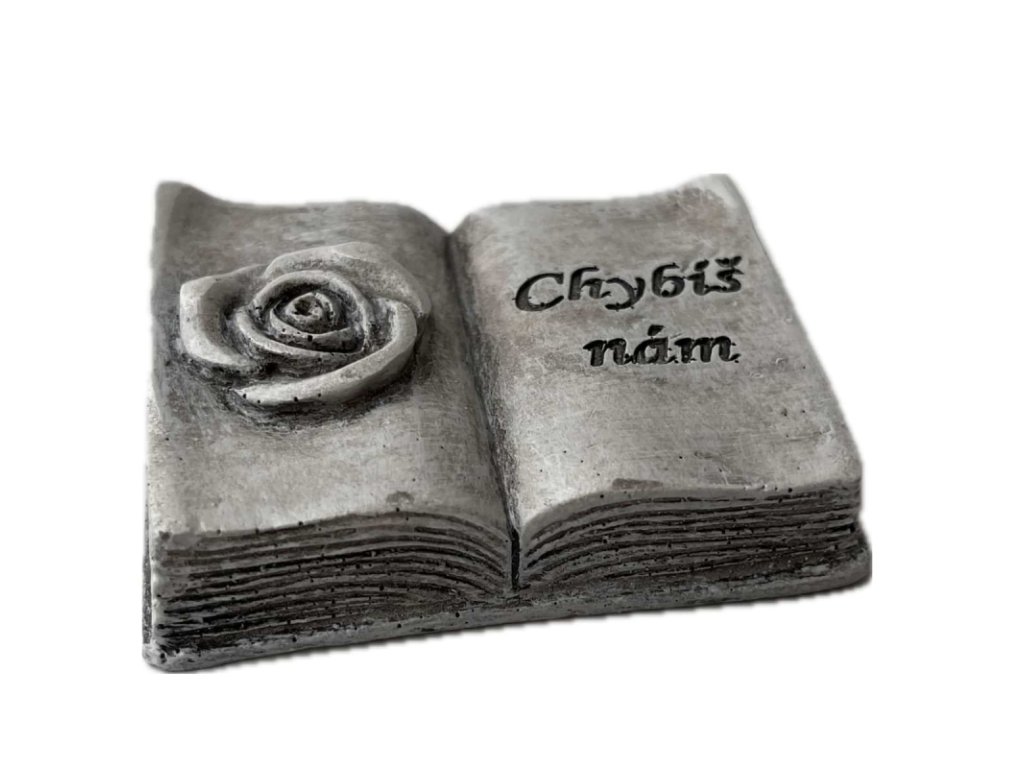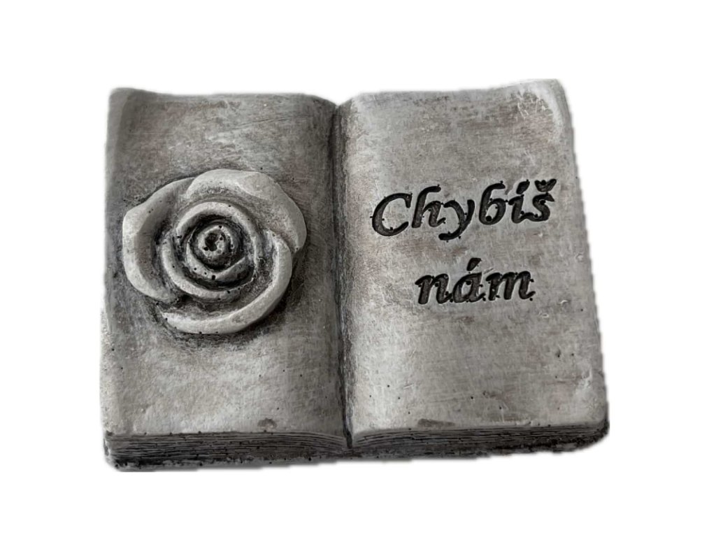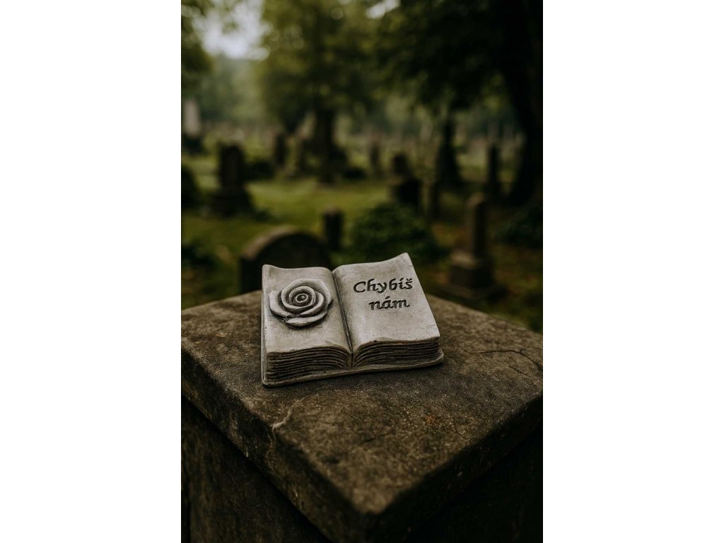 Dekorace na hrob – otevřená kniha s růží a nápisem Chybíš nám