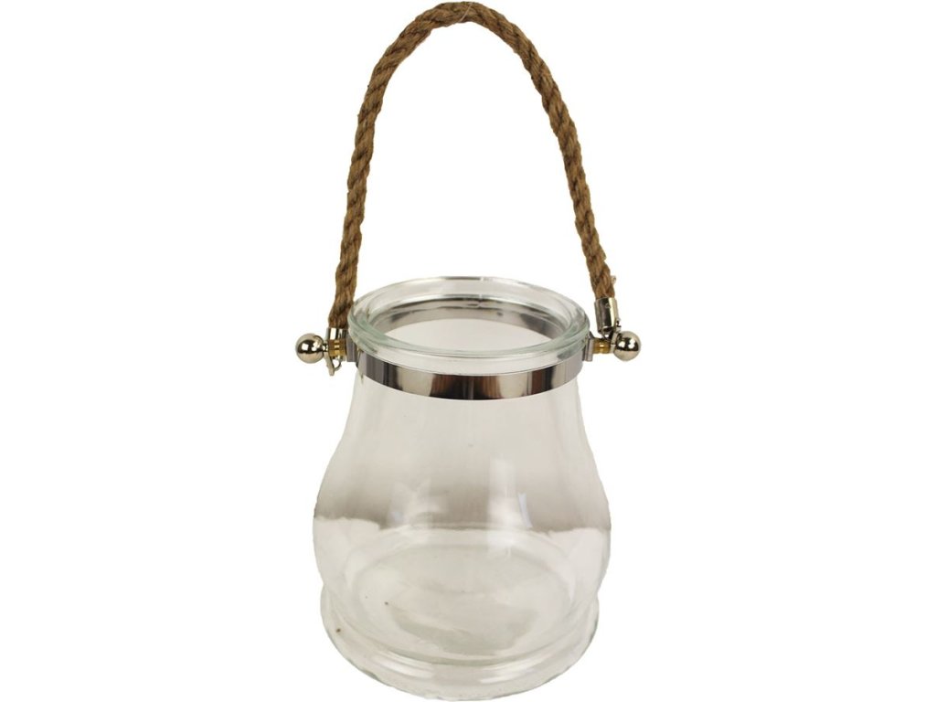 Skleněná dekorace na svíčku. Rozměry: 15 x 15 x 18 cm. Materiál: sklo, juta, kov. Barva: čirá. Upozornění: Nenechávejte zapálené svíčky bez dozoru. Dekorace je určena do interiéru. .Doplňkové parametry