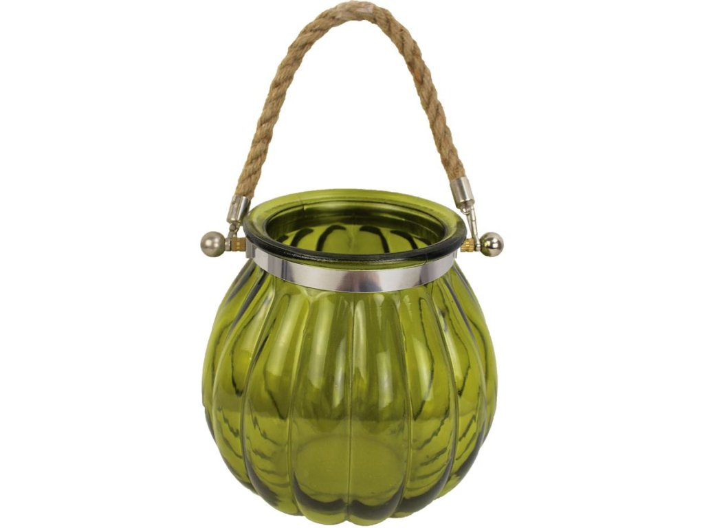 Skleněná dekorace na svíčku. Rozměry: 17 x 17 x 17,5 cm. Materiál: sklo, juta. Barva: zelená. Upozornění: Nenechávejte zapálené svíčky bez dozoru. Dekorace je určena do interiéru. .Doplňkové parametry