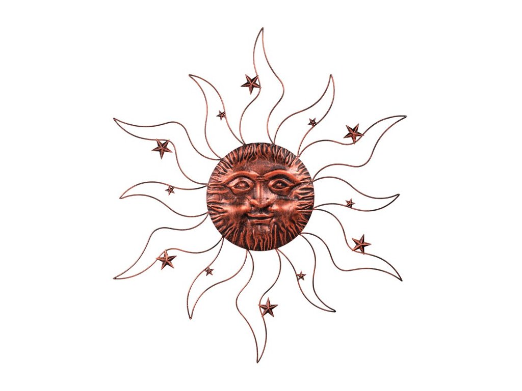 Tato nástěnná kovová dekorace v měděné barvě představuje slunce s paprsky a hvězdami na jejich bocích. Paprsky a hvězdičky jsou nádherně pravidelné a střídají se vždy ve stejném pořadí, vytvářejíce harmonickou a symetrickou ozdobu. Tato dekorace bude skvělým přídavkem zejména na venkovní zdi, a díky svým dostatečně velkým rozměrům bude dominantním prvkem, který upoutá pozornost všech kolemjdoucích. Pro ty, kteří mají rádi astronomii a obdivují nebeské úkazy, bude tato dekorace obzvlášť působivá.Doplňkové parametry