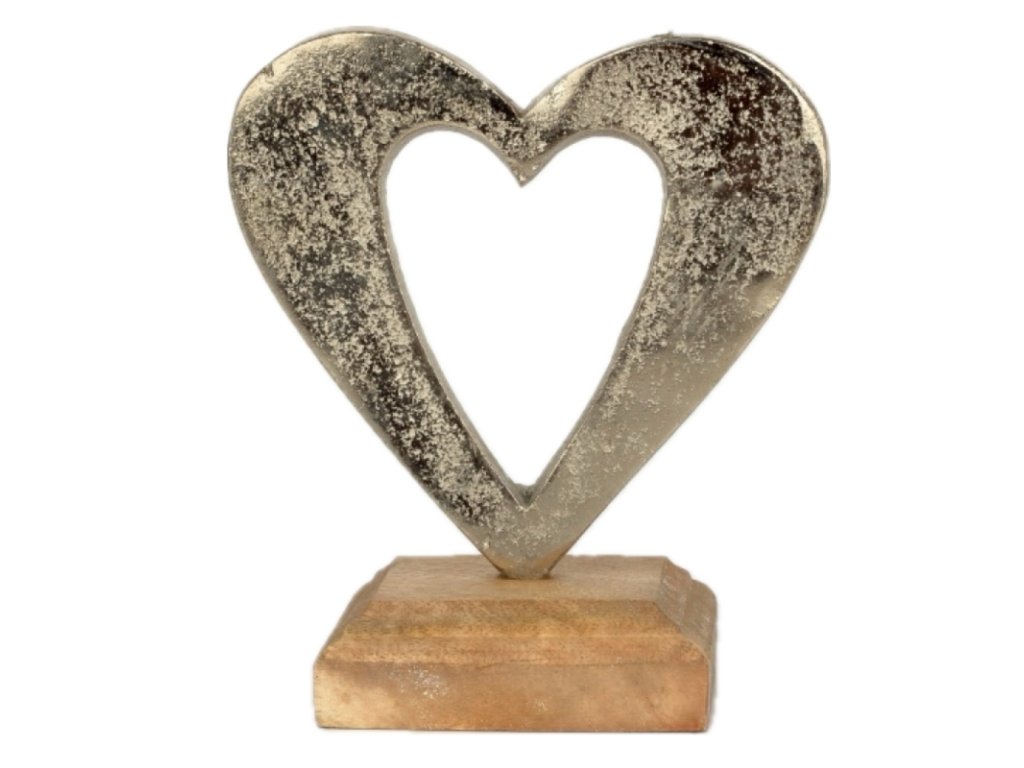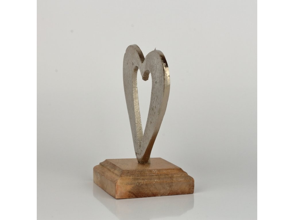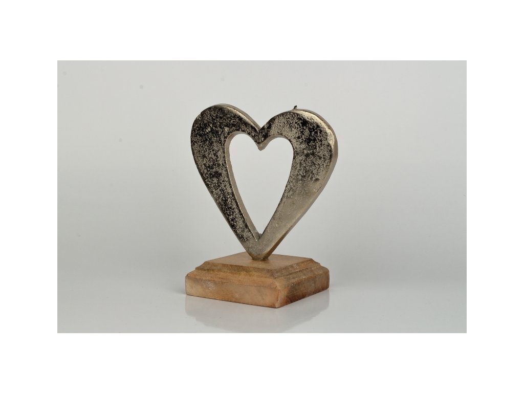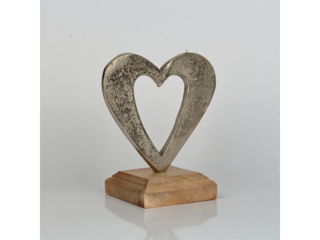 Srdce inspirované láskou je vyrobeno z hliníku a vsazeno do ručně vyřezávané podesty z akátového dřeva.