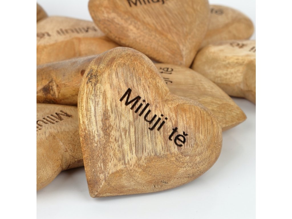 Srdce z lásky ručně vyřezávané z mangového dřeva, s gravírovaným nápisem Miluji tě!