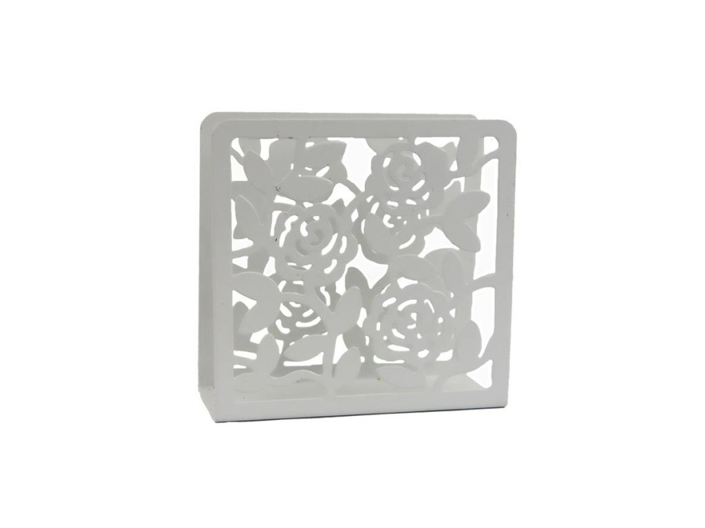 Stojan na ubrousky. Rozměry: 10 x 4 x 10 cm. Materiál: kov. Barva: bílá. Chraňte před vlhkostí. Výrobek je určen pro použití v interiéru.Doplňkové parametry