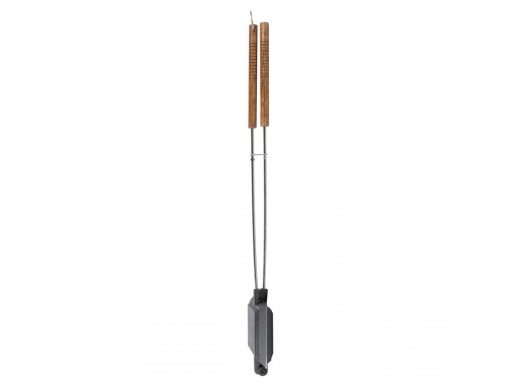 Železný držák s háčkem pro spojení je zakončen rukojetí z březového dřeva a kroužkem pro snadné zavěšení.