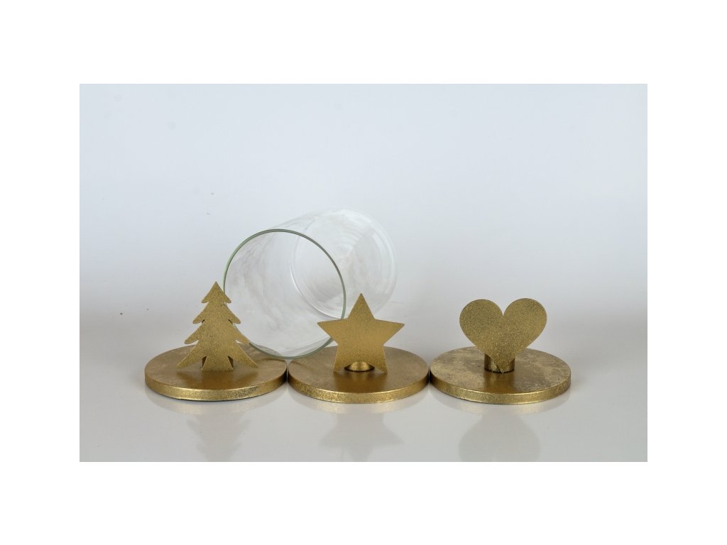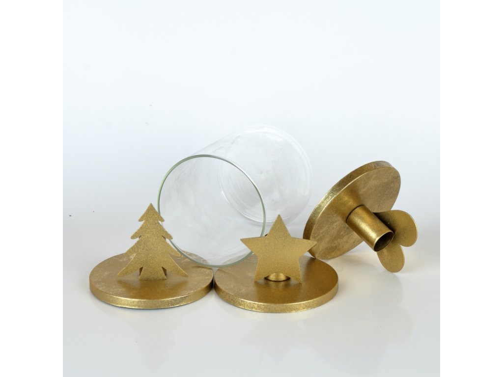 Vánoční dekorace na stůl obsahuje 3 skleněné dózy a plechové vrchní díly s ozdobou symbolu Vánoc. Hvězda, vánoční stromeček a celoročně využitelný se symbolem srdce.
