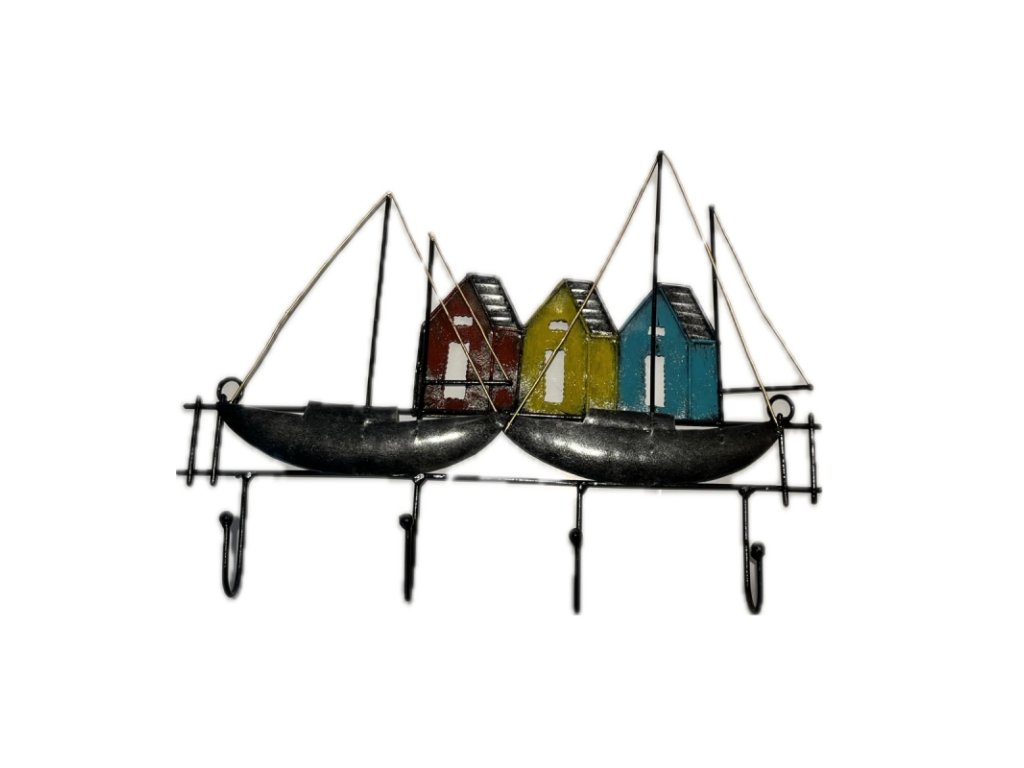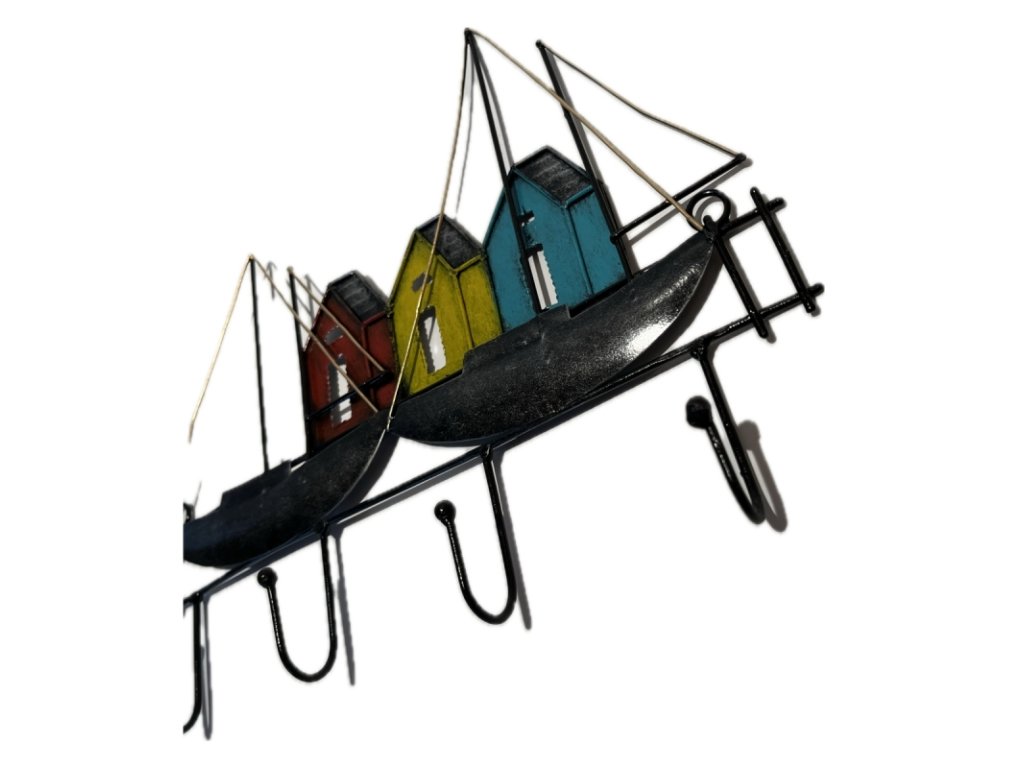 Věšák na klíče se čtyřmi háčky, slouží současně jako krásná stylová kovová dekorce na zeď v námořnickém přímořském stylu. Zakotvené jachtičky u barevných domečků.
