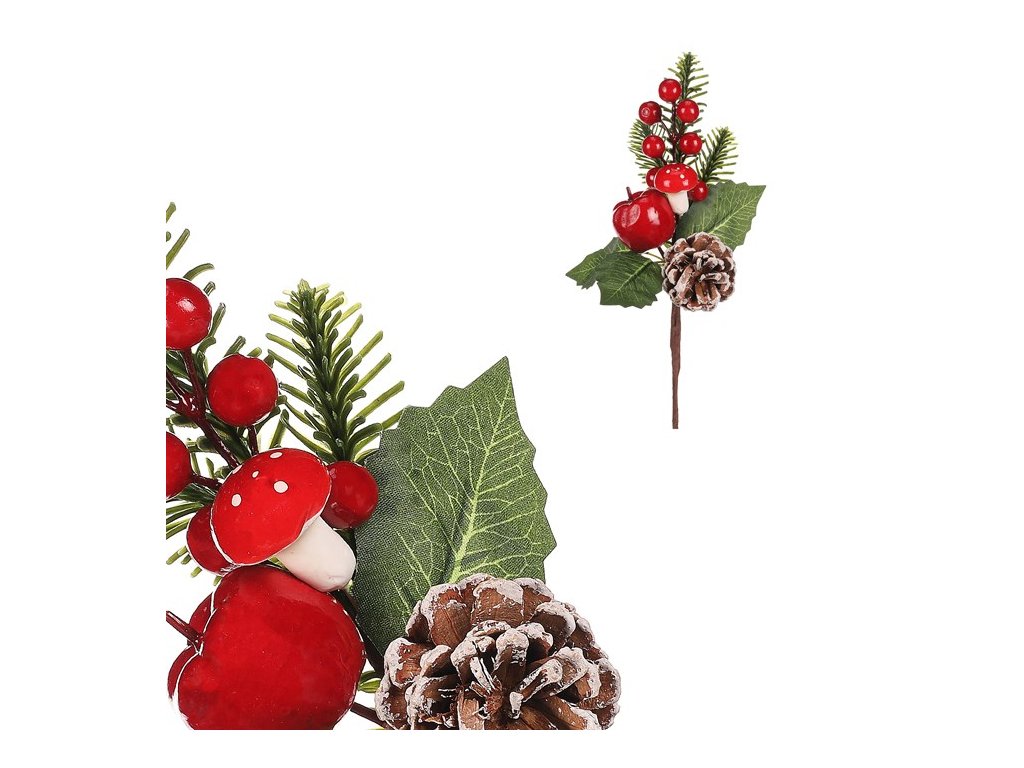 Tato umělá vánoční větvička věrně napodobující rostlinné prvky v přírodních barvách, je skvělým doplňkem pro váš sváteční interiér. Červené bobule, jablíčka a mochomůrka, společně se zelenými umělými lístky doplněné ojíněnou šiškou, přinesou do vašeho domova jedinečnou vánoční atmosféru. Všechny části větvičky vypadají velmi realisticky, jako by byly skutečně ze živých rostlin. Navíc díky trvanlivosti této dekorace nemusíte mít obavy z opadávání nebo uvadání, a tak ji můžete využívat jako trvalou ozdobu každý rok.Doplňkové parametry
