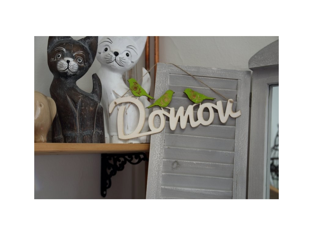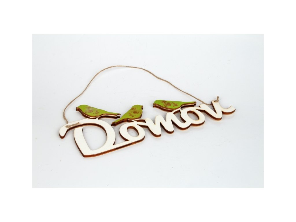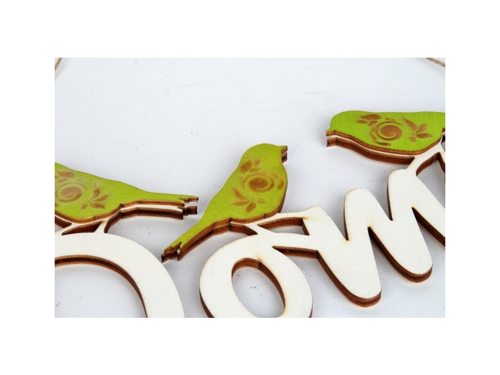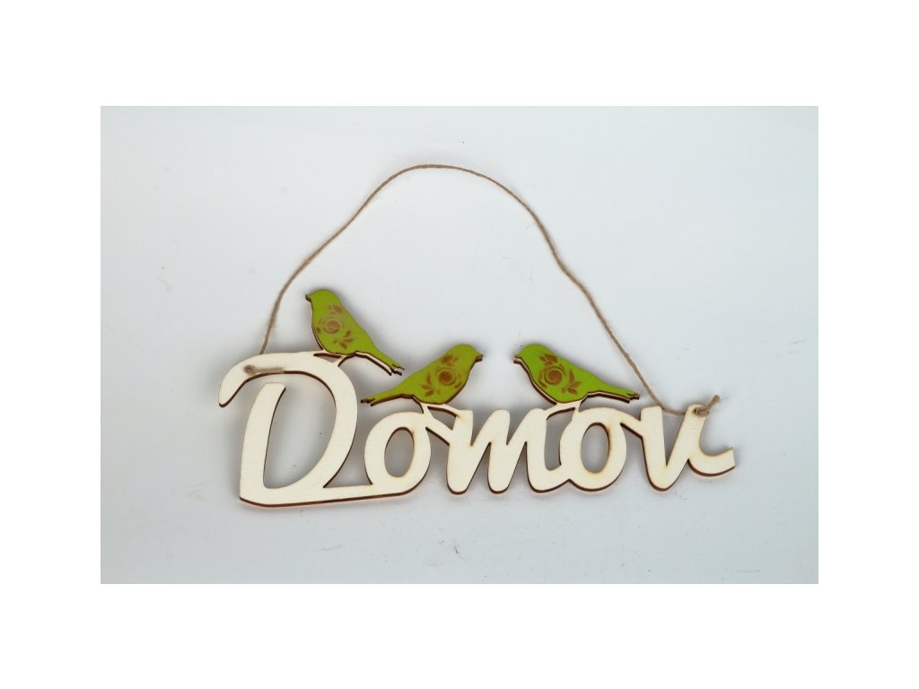 Závěsná dekorace v podobě nápisu Domov, který je ozdoben třemi zelenými ptáčky a vybaven přírodním provázkem, aby jej bylo možné snadno pověsit na dveře, stěnu, či jiné místo.