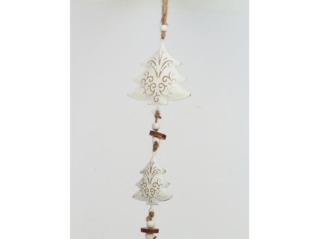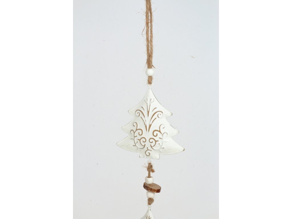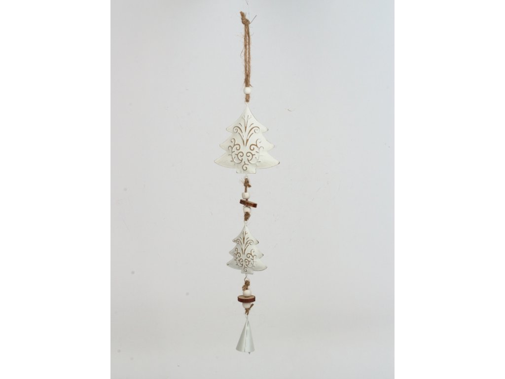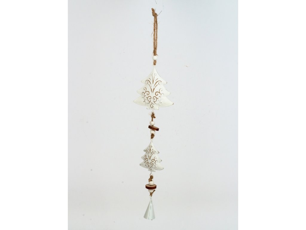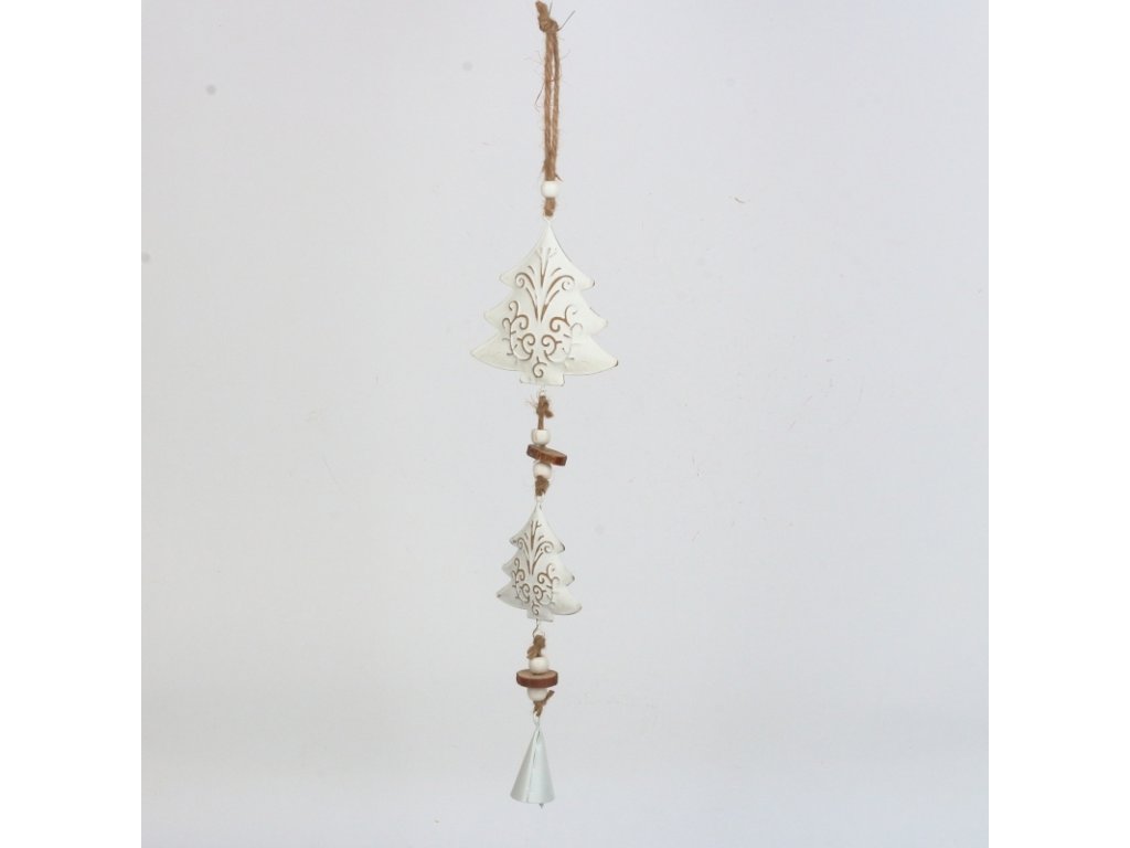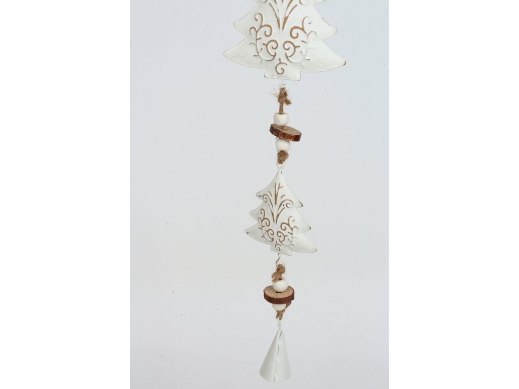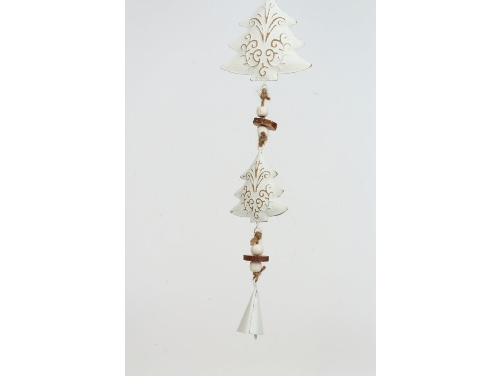 Moderní stromečky s plechovým zvonečkem. Pod bílou patinou jdou vidět krásné ornamenty.